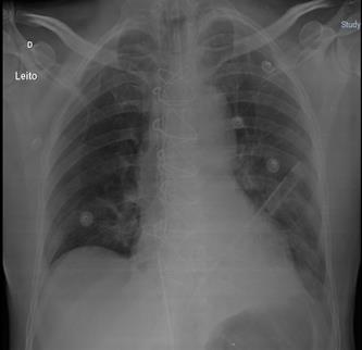 In the intensive care unit, he progressed without the need for vasoactive drugs, being extubated in the first hours after the surgical approach (Figure 1). He was discharged to the infirmary on the 2nd postoperative day, being readmitted to the intensive care unit after 24 hours, with a reduced level of consciousness and desaturation, requiring mechanical ventilatory support. Laboratory tests (Table 1), cultures, radiography (Figure 2) and chest tomography were requested, showing a peripheral ground-glass pattern on CT (Figure 3).
